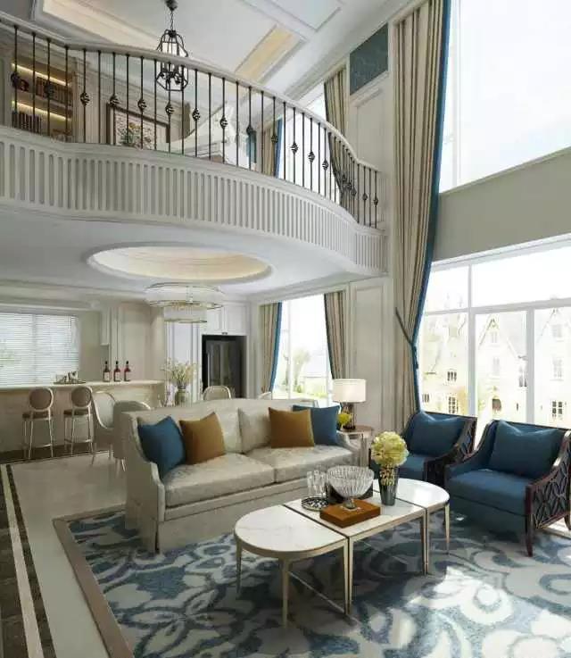 布藝的優(yōu)雅,皮質(zhì)的粗獷,水晶的浪漫,青花瓷的東方韻味,融合在高挑空的客廳里,空氣中都流動著自由的味道。不同深淺的藍構成豐富的視覺層次,使諾大的空間保持完美的統(tǒng)一。