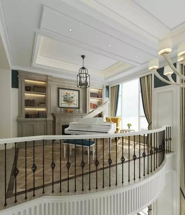 多功能間既是書房也是琴房,不大的空間講述著一段寂靜而美麗的故事。復古感的元素、花紋與線條融入設計,每一處細節(jié)都是精美的藝術片。湖藍色的坐墊與純白的鋼琴搭配,隨時迸發(fā)出藝術的靈感。