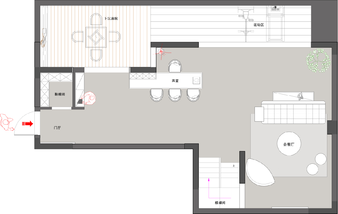 1?地下室負(fù)二層,我們做的是一個(gè)下沉式庭院,解決了地下采光的問題,下面功能主要是會(huì)客休閑,健身區(qū)域,入戶做了一個(gè)獨(dú)立的鞋帽間。