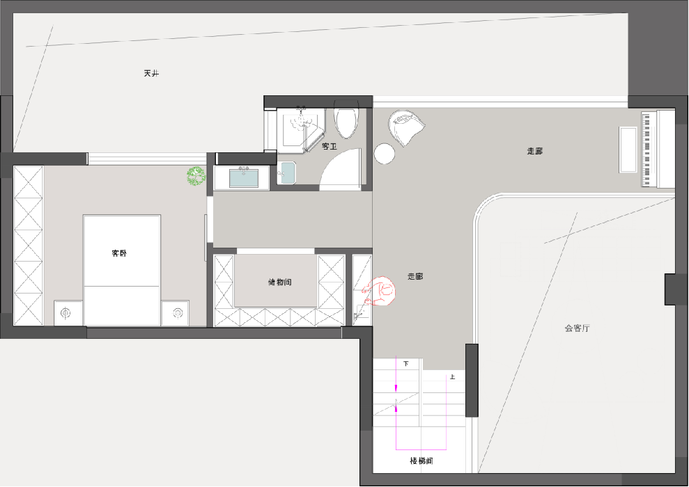 2?負(fù)一樓夾層保留了挑空區(qū)域,一部分用于儲(chǔ)藏空間,其他是客臥客衛(wèi)。