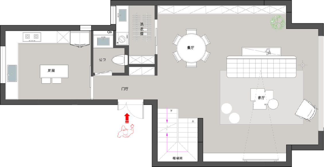 3?一樓規(guī)劃也是很合理,客餐廳一體的大空間,南面一小塊做了單獨(dú)的洗衣晾曬區(qū)。